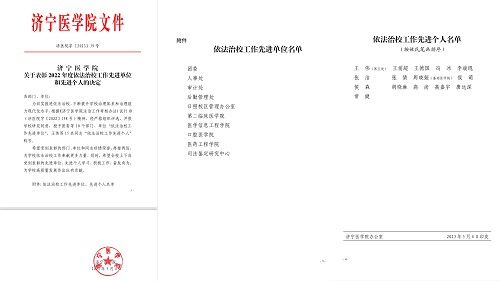 5月4日,在济宁医学院发布的《关于表彰2022年度依法治校工作先进单位和先进个人的决定》文件中,司法鉴定研究中心榜上有名,荣获“依法治校示范校先进单位”、侯森荣获“依法治校先进个人”称号。