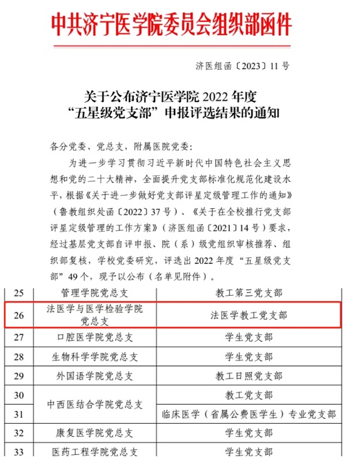 近日,法医学教工党支部荣获“五星级党支部”称号。2022年,教工党支部认真开展学习教育,紧紧围绕司法鉴定中心工作,积极发挥党支部的战斗堡垒作用,为高标准做好鉴定工作提供了坚强政治保证。